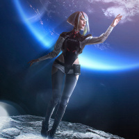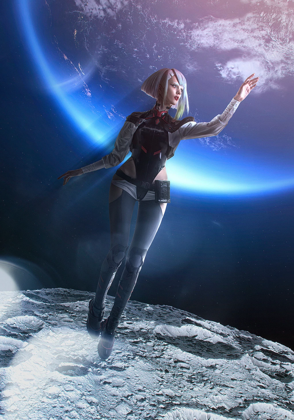 signature outfit, which includes a bodysuit with high-tech details, and she has distinctive cybernetic arms. Lucy is standing on what appears to be an extraterrestrial surface or platform with