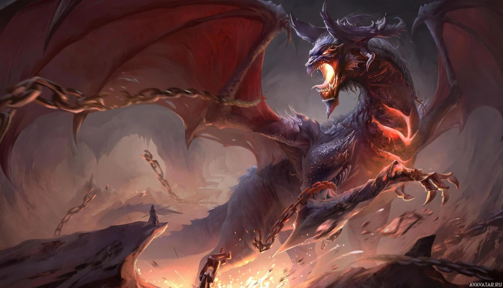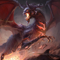 a fantastical scene with two dragons. One of the dragons is larger and more prominent, appearing fierce and commanding, while the other one is smaller and seems to be in a submissive or defensive position. The background suggests a dramatic setting with dark clouds or smoke, and there are some flames visible on the ground that could indicate