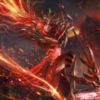 a powerful figure, possibly a sorceress or demon queen, as suggested by her dark attire and the chaotic magical elements around her. There are flames and sparks flying around her, indicating that she might be casting fire or controlling