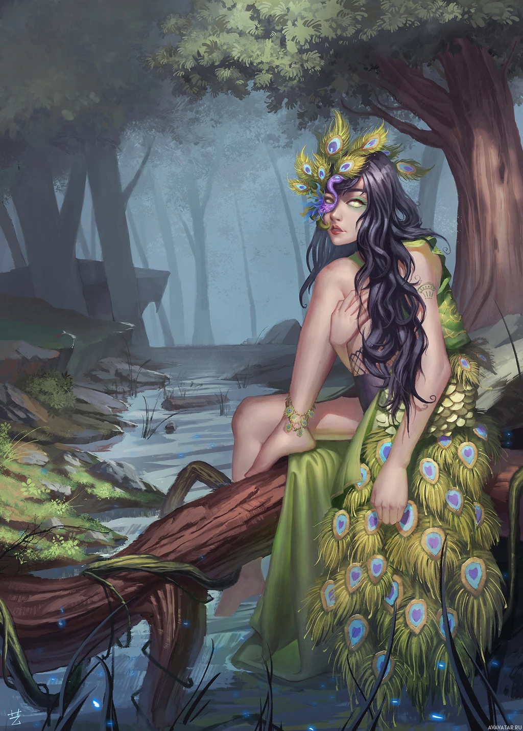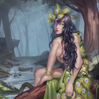 elaborate costume and jewelry that suggest she might be from a magical or mythical realm, possibly inspired by Indian or Middle Eastern cultural motifs. The setting appears to be a forest, and there are elements such as a butterfly resting on her shoulder, adding to