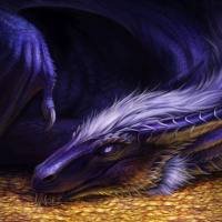 a natural setting or perhaps the aftermath of a battle. Below the dragon are piles of gold coins, indicating treasure or a hoard, which is commonly associated with