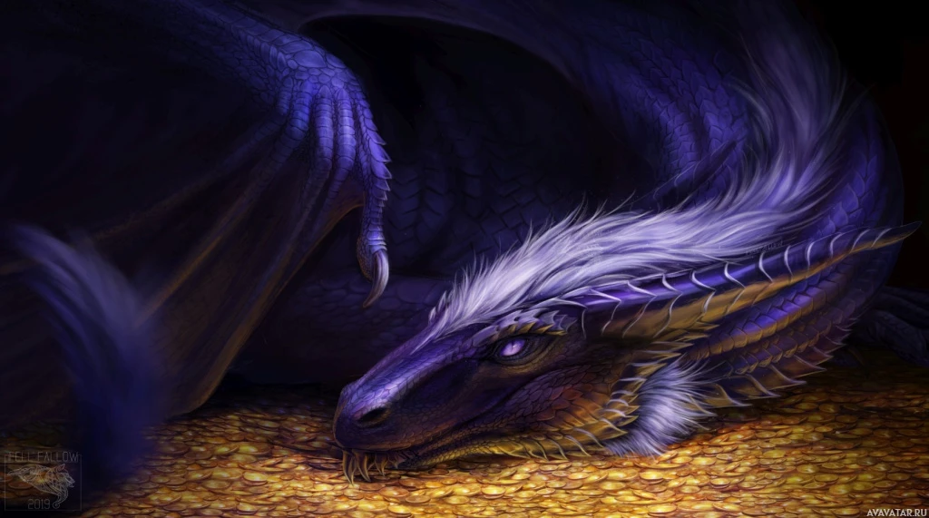 a fantasy scene featuring a dragon. The dragon has a predominantly purple and white color scheme, with its body covered in scales that give it an intimidating appearance. It is surrounded by fallen leaves, suggesting