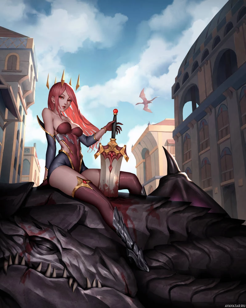 a confident expression on her face. The setting seems to be a fantasy-themed cityscape, possibly inspired by ancient Roman architecture, with buildings visible in the background. The sky is partly cloudy, suggesting either
