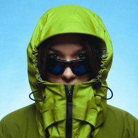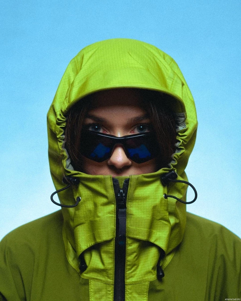 На картинке изображен человек в зеленой куртке с капюшоном и солнцезащитных очках. Судя по голубому фону, человек находится на улице при дневном свете и ясном небе. Выражение лица человека кажется сосредоточенным или задумчивым, он смотрит прямо в камеру, избегая зрительного контакта.