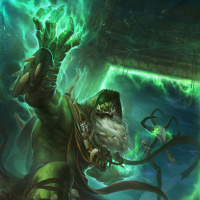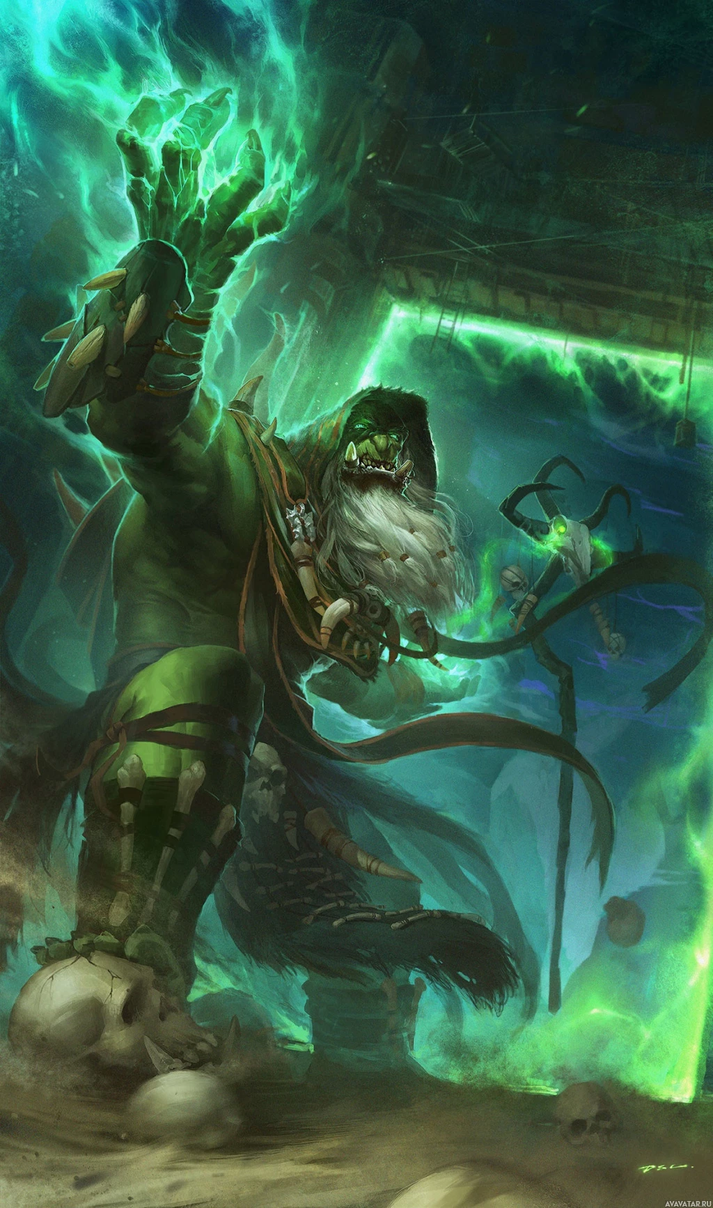 На картинке изображен фантастический персонаж-орк из вселенной "Варкрафт". Этот персонаж известен как Гул'дан, культовый злодей-чернокнижник, который владеет могущественной магией и часто изображается с угрожающим выражением лица. Он одет в темные доспехи, а его лицо похоже на череп, что характерно для его роли мастера магии смерти. Фон позволяет предположить, что он находится в готической или зловещей обстановке, соответствующей его зловещему образу.