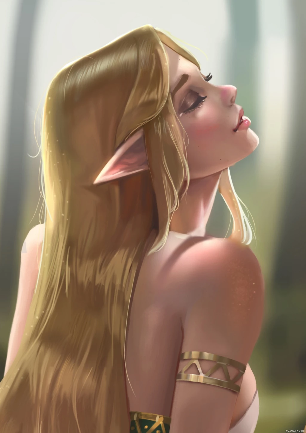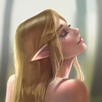 an elf character. The elf is shown from behind, with her eyes closed as if she's lost in thought or feeling