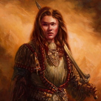The image depicts a character who appears to be a warrior or warrior-like figure, possibly inspired by fantasy genres. The person has red hair and is wearing armor, holding a sword in their right hand. They are standing against an atmospheric background that suggests a battlefield or a place of conflict.