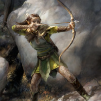 The image depicts a fantasy scene featuring an elf. The elf is shown in profile, standing on rocks and holding a bow with an arrow drawn back, suggesting readiness for archery or hunting. The background includes natural elements such as trees and shrubs, contributing to the fantastical atmosphere of the image.