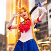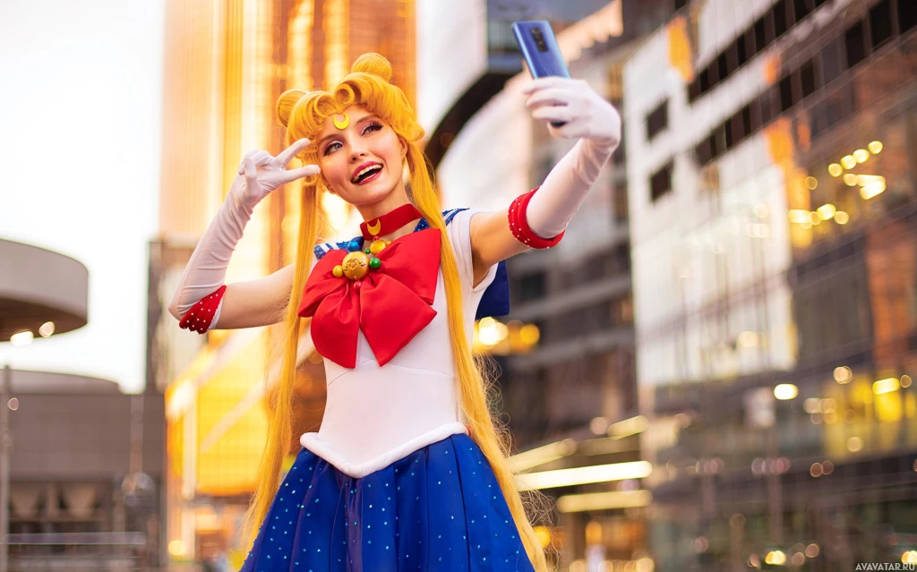 The image features a person dressed in cosplay as Sailor Moon, a popular