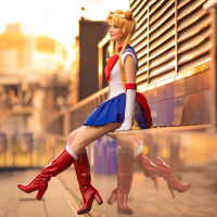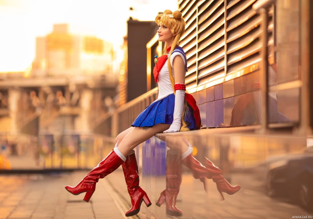 the iconic outfit with the tiara, boots, and skirt associated with this cosplay. The backdrop suggests they might be in a city setting during sunset or sunrise, as indicated by