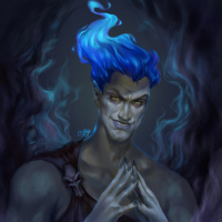 blue flames emanating from his head, suggesting a representation of power or energy associated with the underworld. His expression and posture convey a sense of mischievousness or devious scheming, which is often attributed to the character in