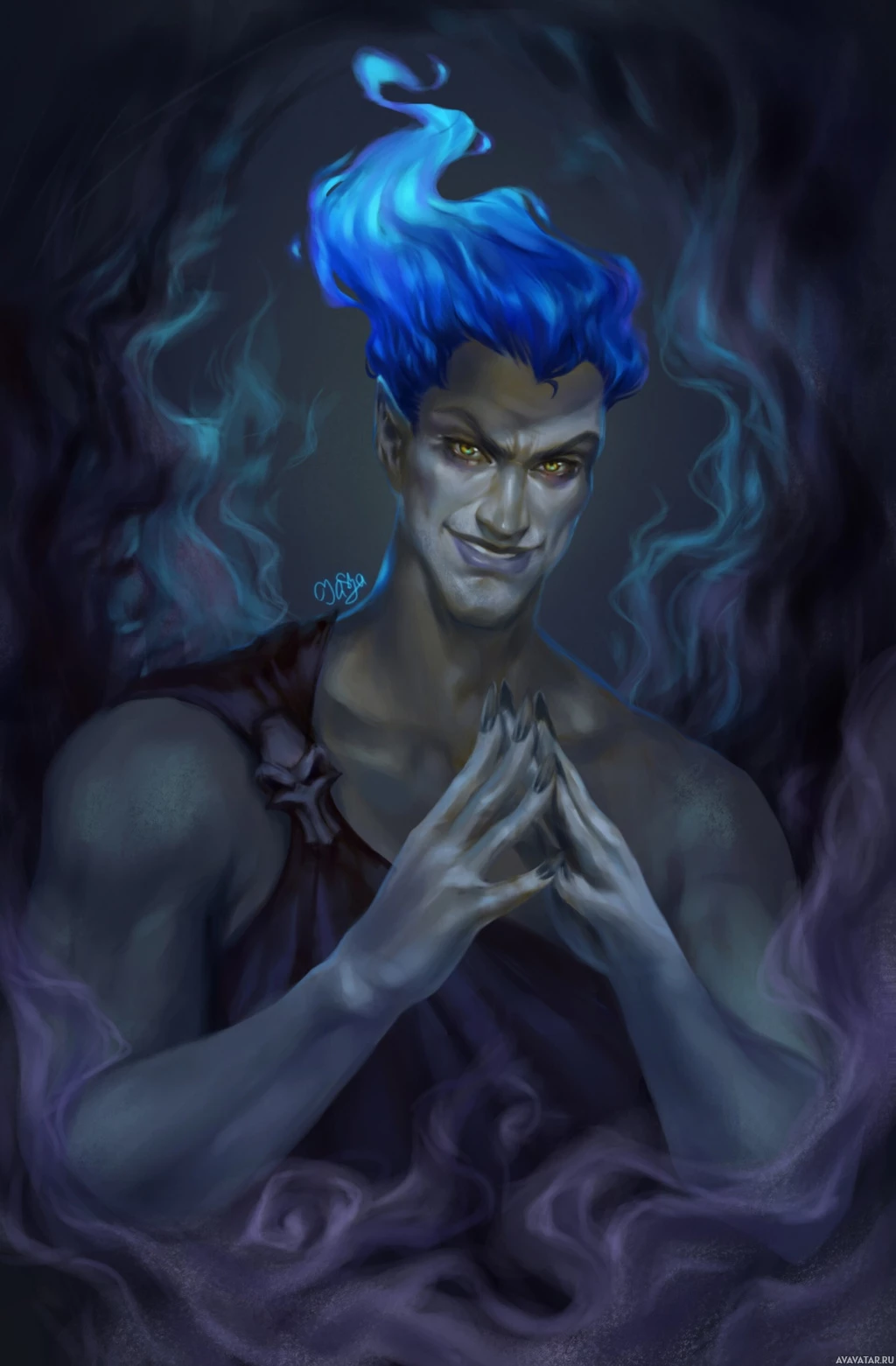 The image depicts a character who appears to be Hades, the god of the underworld from