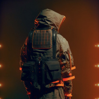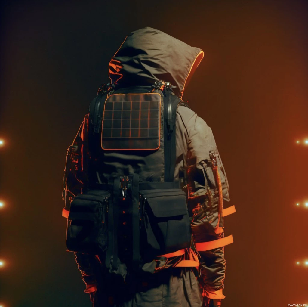 an astronaut suit or space outfit, which includes a hood and a backpack. The backpack seems to have solar panels on it, suggesting that the gear is designed for functionality in