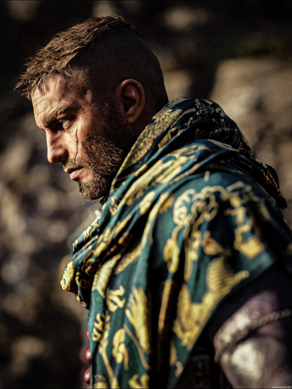 The image depicts a person standing with their head turned, looking off to the side. They are wearing what appears to be a historical or fantasy-themed outfit, featuring a patterned garment that could suggest