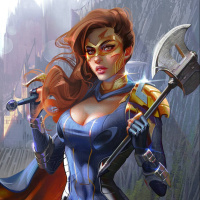 На картинке изображен персонаж женского пола с рыжими волосами, держащий топор. На ней костюм, напоминающий наряд супергероя, дополненный накидкой и чем-то похожим на броню на плечах и груди. Обстановка напоминает обстановку в стиле фэнтези или комиксов, что, возможно, указывает на то, что она является персонажем истории, действие которой разворачивается в таком мире.