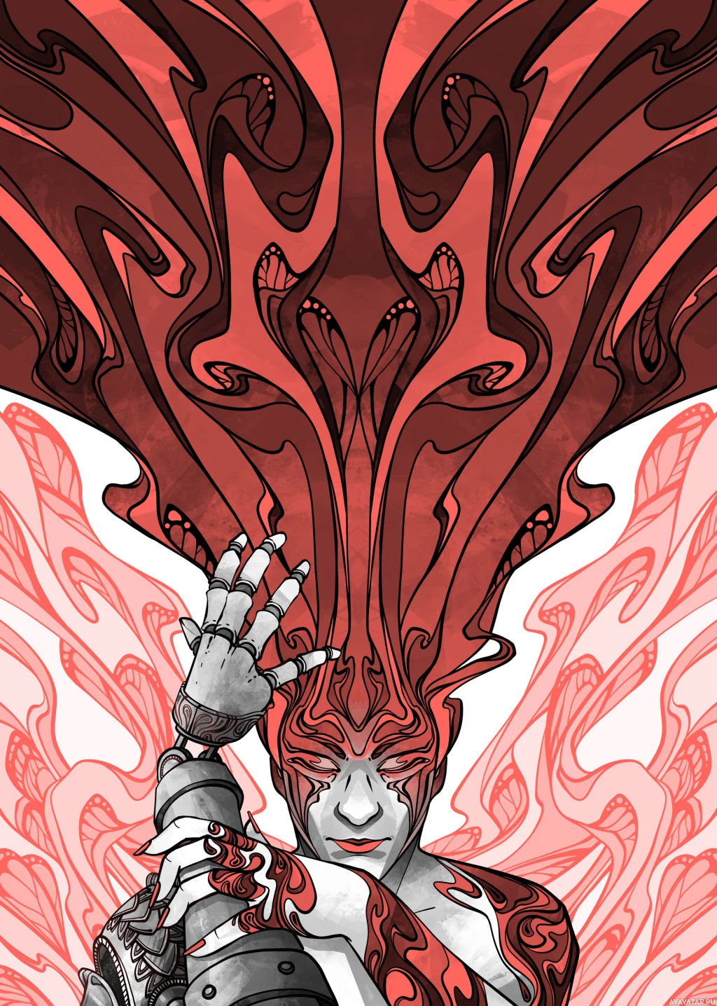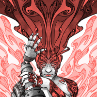 a fantasy character. The character appears to have wings and is adorned with what looks like armor or a costume that is red, white, and black in color. There are