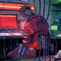 a science fiction or cyberpunk-themed environment. In the foreground, there is a character seated at a desk with various
