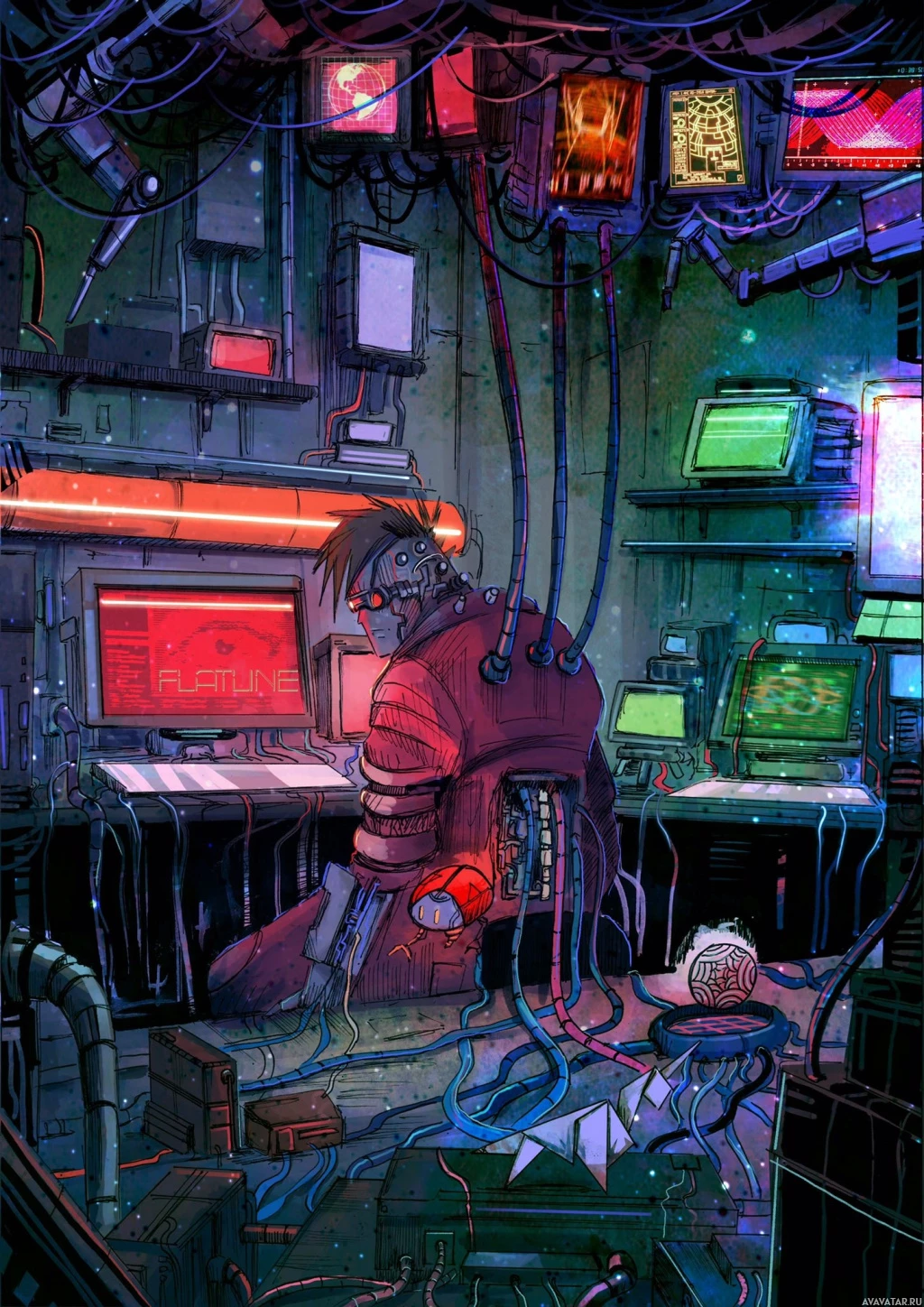 electronic devices and equipment around them. This character has a somewhat disheveled appearance, suggesting they might have been engaged in their work for