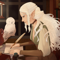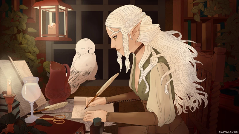 white hair. The elf appears to be writing or drawing at a desk, surrounded by various items that suggest a fantasy setting such as a bird (likely a raven), a book, and other fantasy-themed objects like a lamp and a vase. There's also an owl perched nearby, adding to
