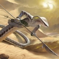 a fantasy scene depicting a humanoid figure riding on the back of a large, snake-like creature. The figure is wielding a lance and seems to be engaged in an action or battle, possibly with another