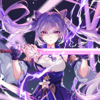 На картинке изображен анимационный персонаж, молодая девушка с фиолетовыми волосами и красными глазами. Она одета в сине-золотой наряд, напоминающий доспехи или боевой костюм, в комплекте с мечом, который она держит в правой руке. Ее также окружают фиолетовые энергетические или световые эффекты, которые придают персонажу фантастический вид. Художественный стиль предполагает, что это может быть из аниме-сериала или фильма.