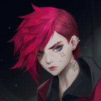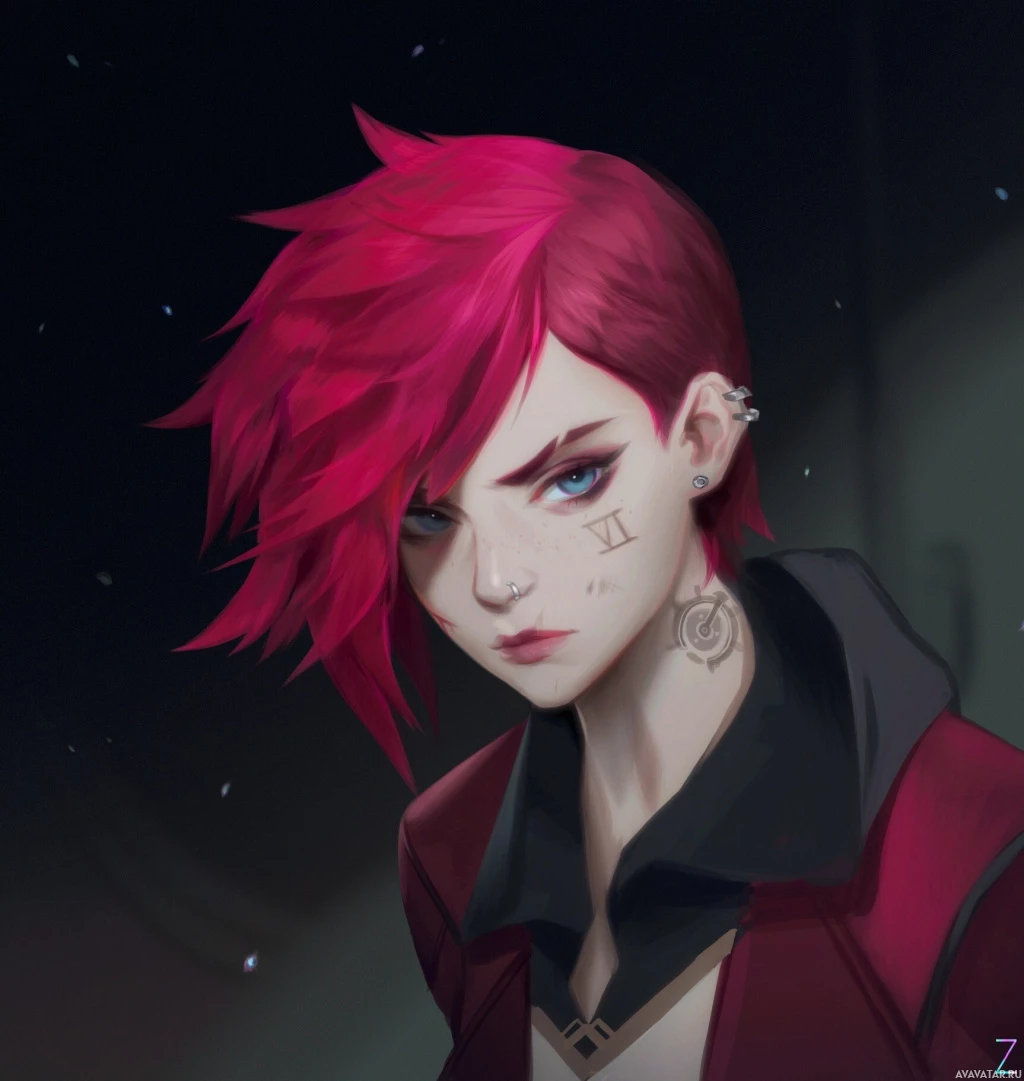 pink hair and has distinct facial features such as tattoos on her neck, one visible piercing, and a stern expression on her face. Vi is known for her