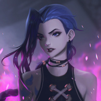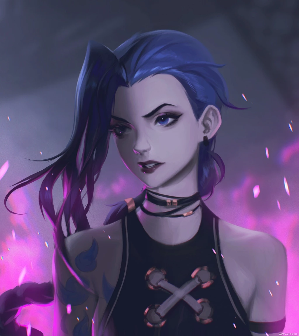 the video game "League of Legends," known as Jinx. She is depicted with purple hair,