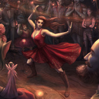 red dress and dancing energetically in front of an audience. The audience consists of various characters; some are dressed in