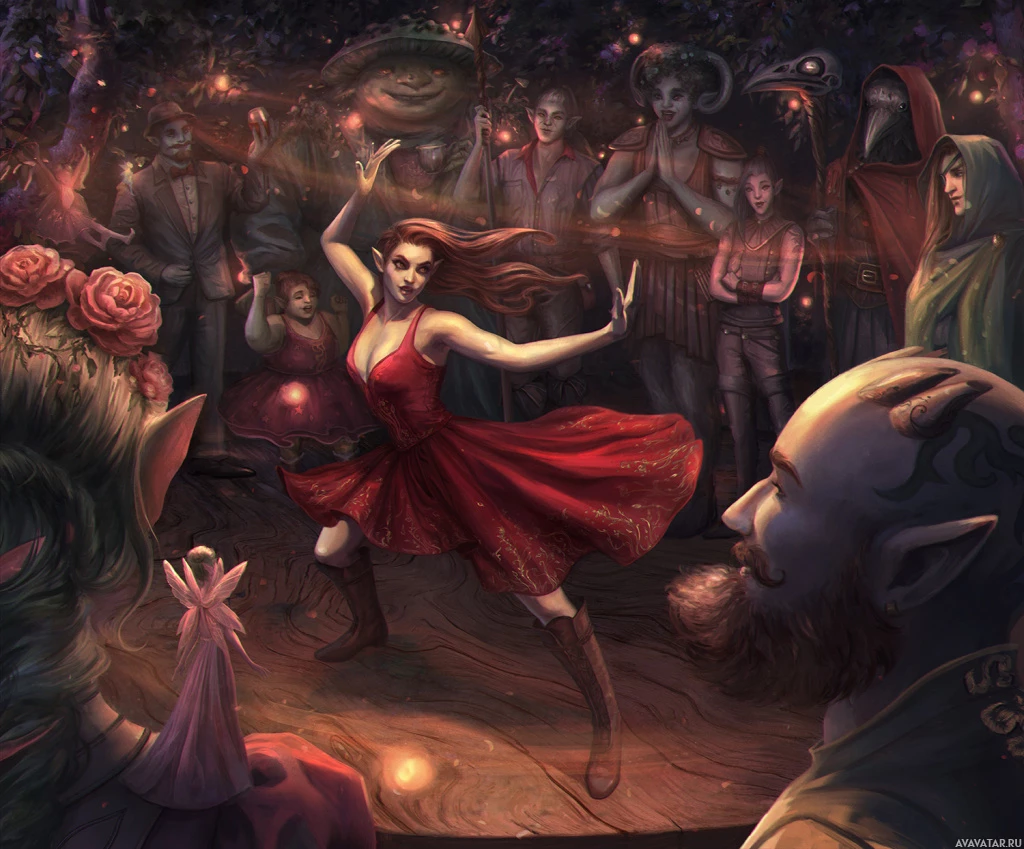 a fantasy scene with several individuals. A red-haired elf is the central figure, wearing a vibrant