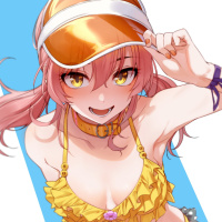 На картинке изображен анимационный персонаж, девушка с розовыми волосами, одетая в желтый купальник. Она машет рукой и, кажется, находится в веселом или возбужденном настроении. Судя по ее одежде и позе, на улице солнечно, возможно, она на пляже.