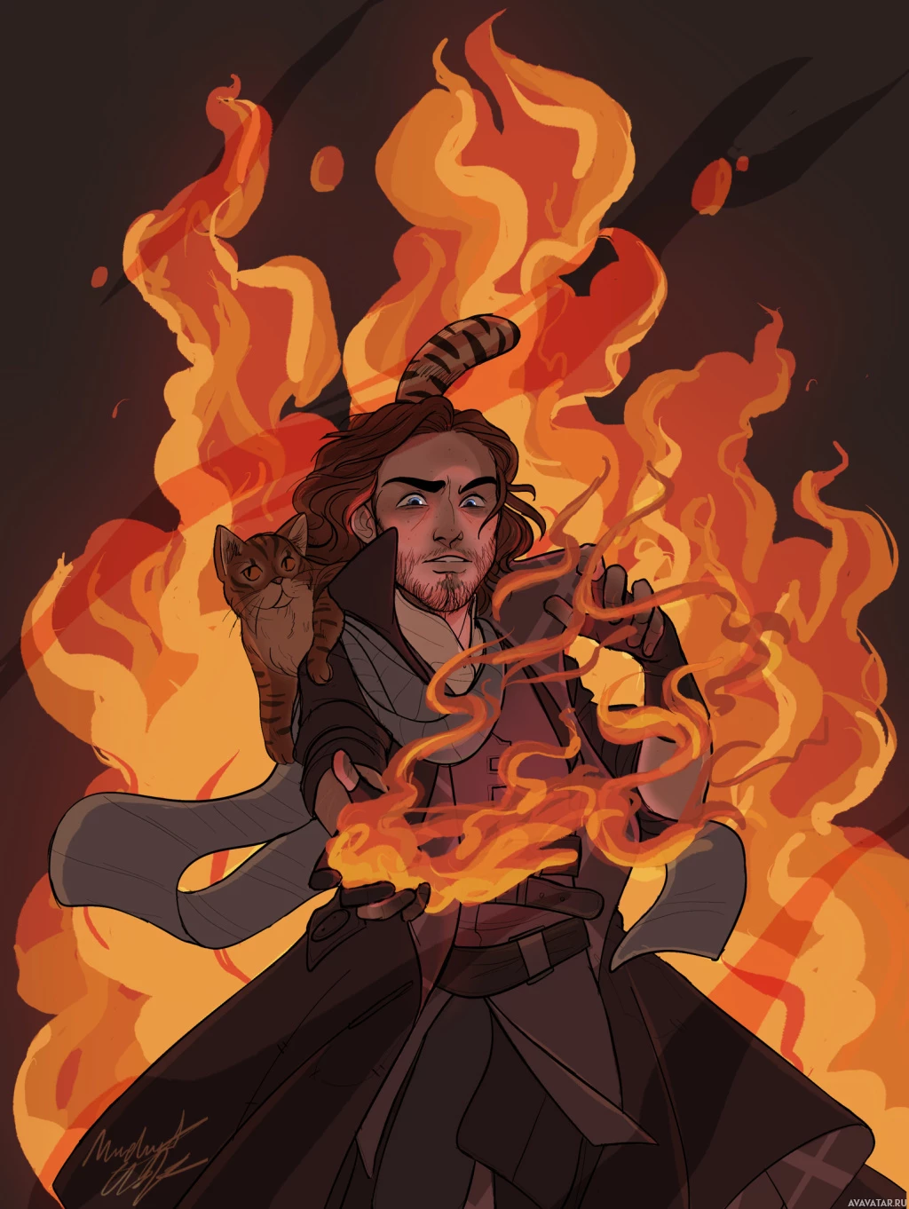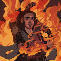 The image depicts an illustration of a character with a fiery theme. The person appears to be male, dressed in clothing that looks like it could be from