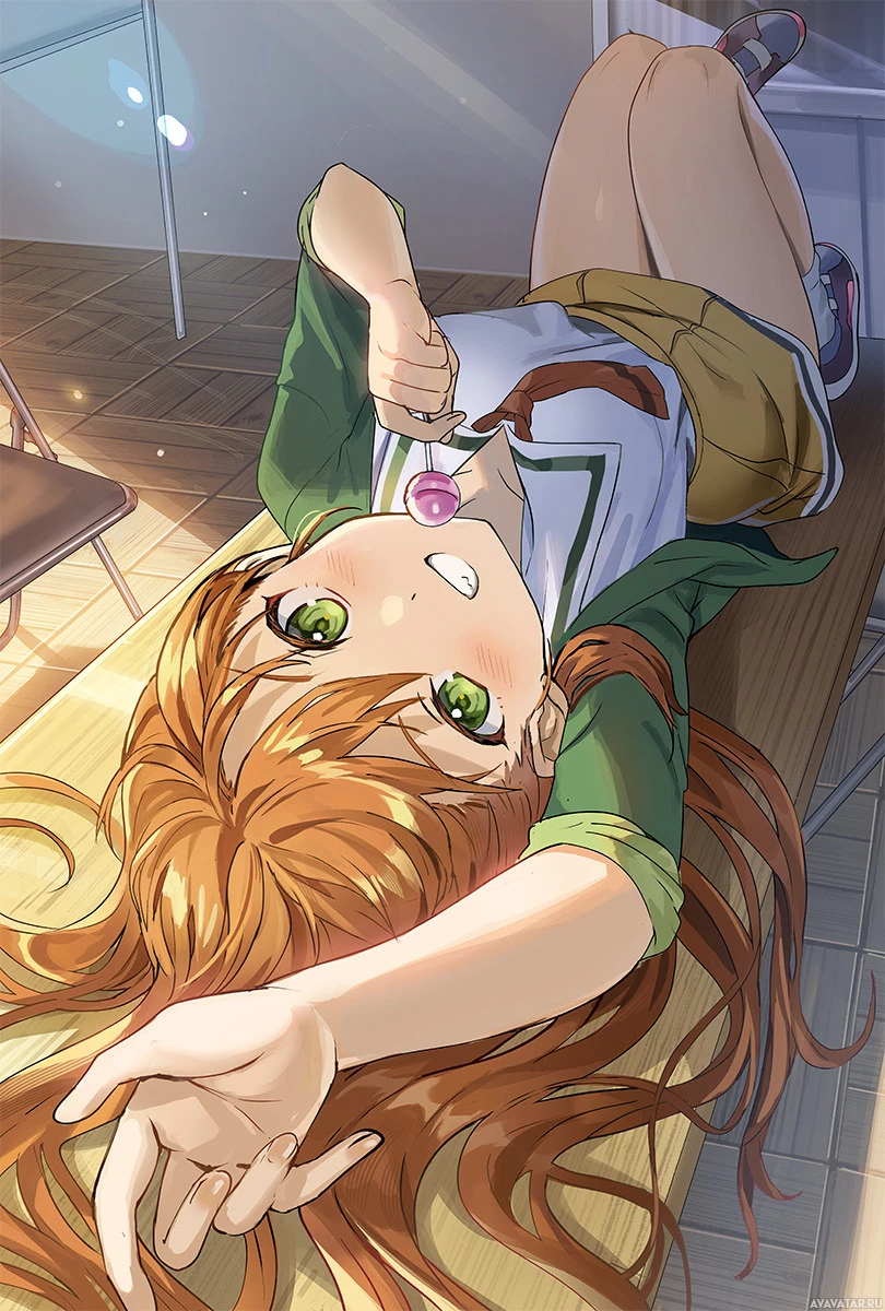 red hair and green eyes. She's lying on her back with one hand stretched out, looking relaxed. There are candy or confections visible near her mouth, suggesting she might be enjoying them while she lounges. The scene appears to take place indoors, possibly in a cozy, informal setting like