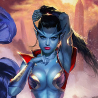 mythical creature, as indicated by her pointed ears and the fantastical elements in the background. The character is styled in