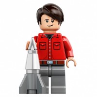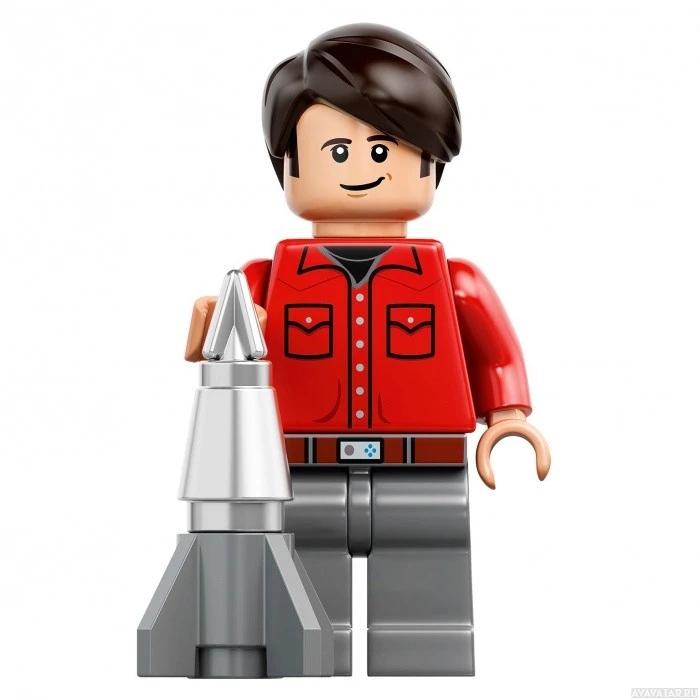 a LEGO figure holding a small rocket or missile with its right hand. The character is wearing a red and gray jacket, similar to the style of the Lego minifigures, which are designed to resemble humans in