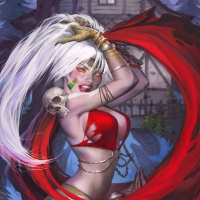 white hair and is dressed in what appears to be an armor or costume with red elements, such as the cape draped over one shoulder. Her outfit includes a skirt and a top that are part of her