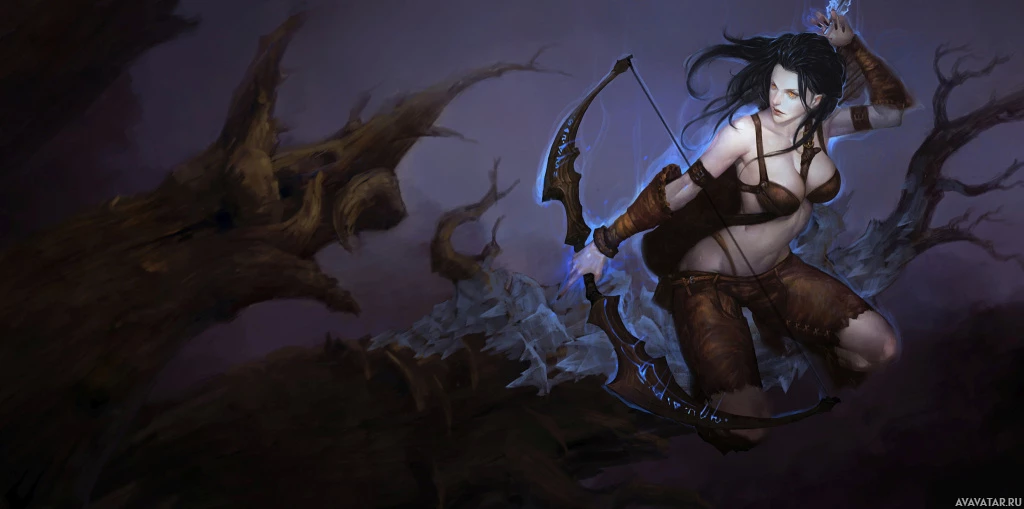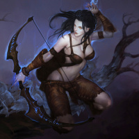 dark hair, holding a bow and aiming it towards the viewer. She is depicted in an archery stance, wearing armor that suggests she might be a warrior or ranger-like figure from