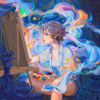 floating stars or sparkles around her work. The atmosphere of the image suggests