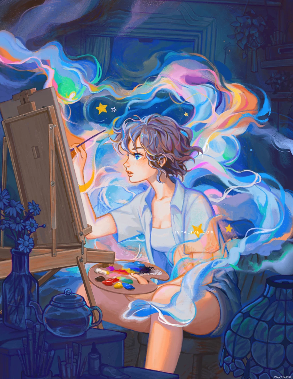 an animated character, a girl with brown hair, sitting at a painting easel. She is holding a paintbrush in her hand and appears to be creating a magical or fantastical scene, as indicated by the smoke-like lines and what seems like