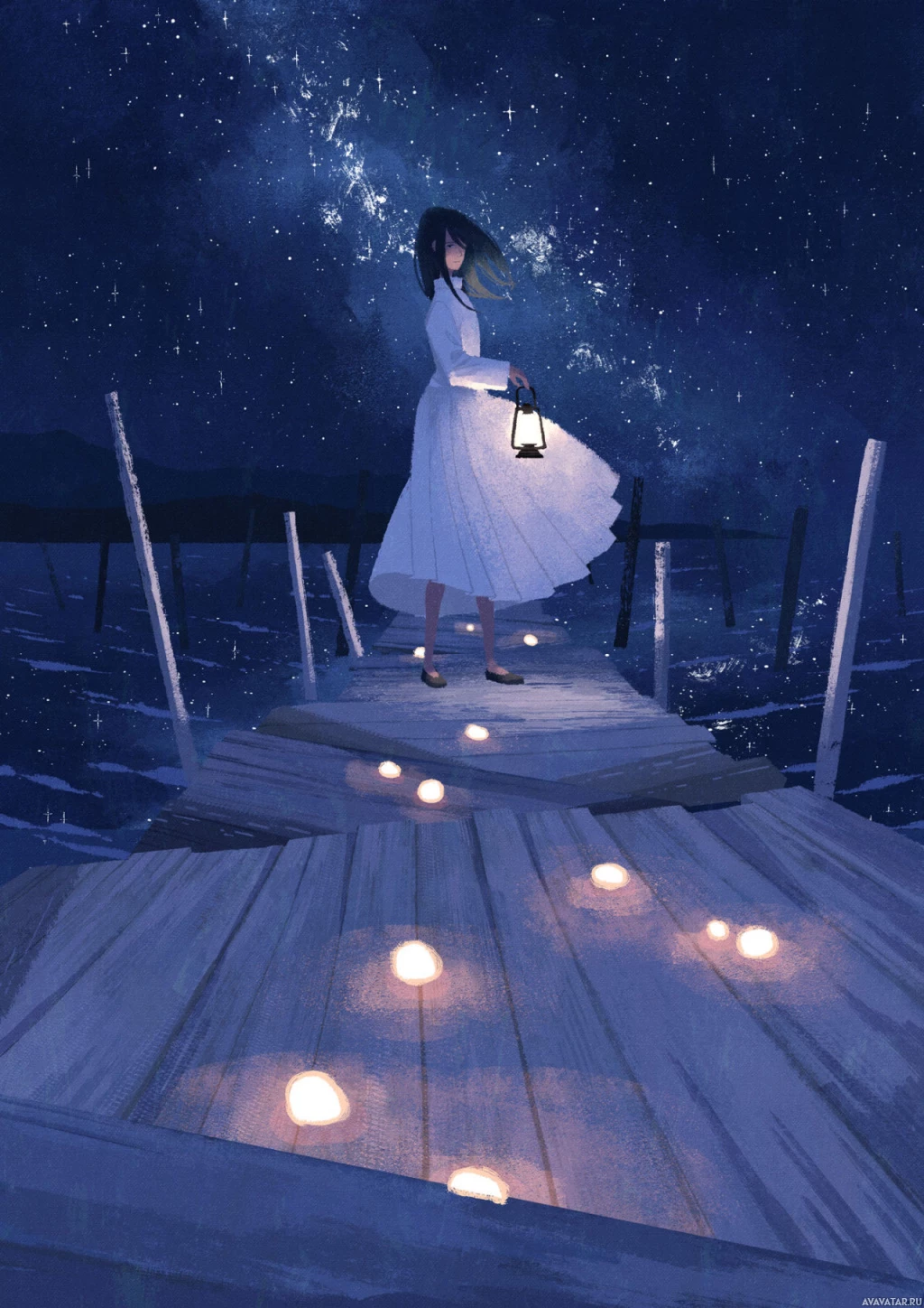a young girl with dark hair, standing on what appears to be a dock or pier at night. She is wearing a dress and holding a lantern, which casts