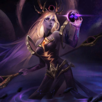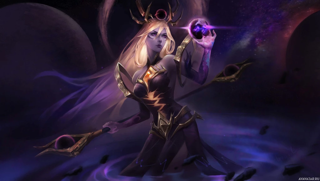 The image depicts a fantasy character who appears to be a girl with a magical or mystical theme. She is holding what looks like a wand and is surrounded by various magical artifacts, including an orb in her hand. Her attire suggests she might have a role related to magic or witchcraft within the context of this fantasy setting. The background features cosmic elements such as stars and planets, which adds to the otherworldly atmosphere of the image.