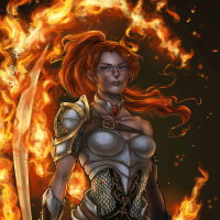 a fantasy character. There are flames around her, indicating she may have some connection to