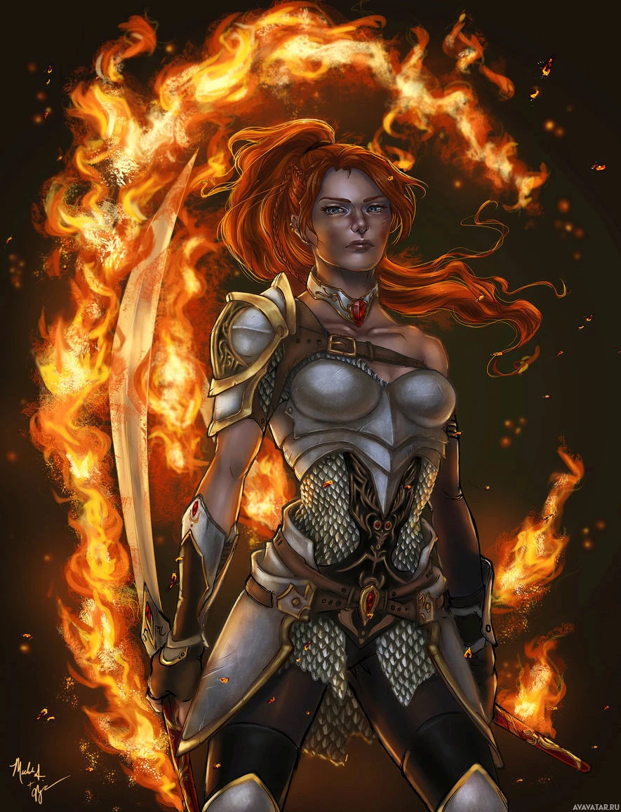 fire magic or is skilled in combat. The image does not contain any explicit text, and it appears to be an illustration rather than a photograph of