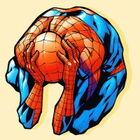 comic books published by Marvel Comics. In the illustration, Spidey is shown with his head bowed down and his hands placed on his hips, which can be interpreted as a posture that suggests sadness or frustration. The character is wearing his iconic red-and-