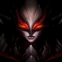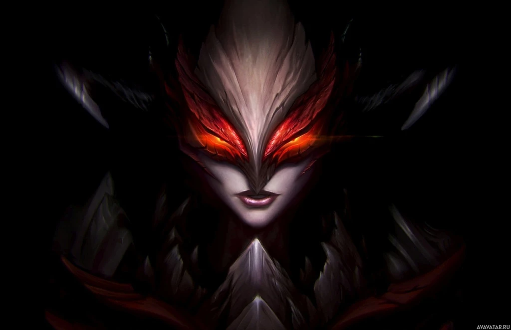 red eyes, pointed ears, and is wearing an elaborate mask or headgear that has a fierce design, suggesting she might be a warrior or a supernatural creature of some sort. Her expression is intense and somewhat menacing, which adds to the overall fantasy theme of the image.