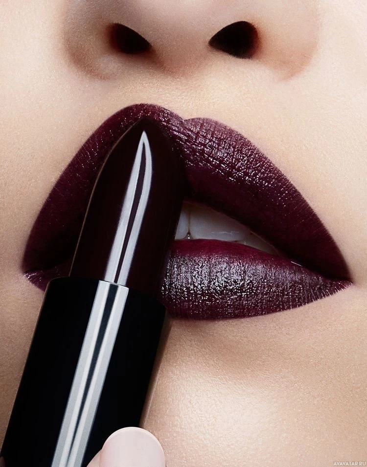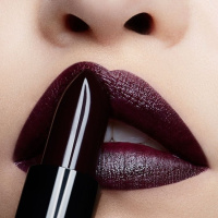 a dark lipstick. They appear to be applying the lipstick with precision, as suggested by their