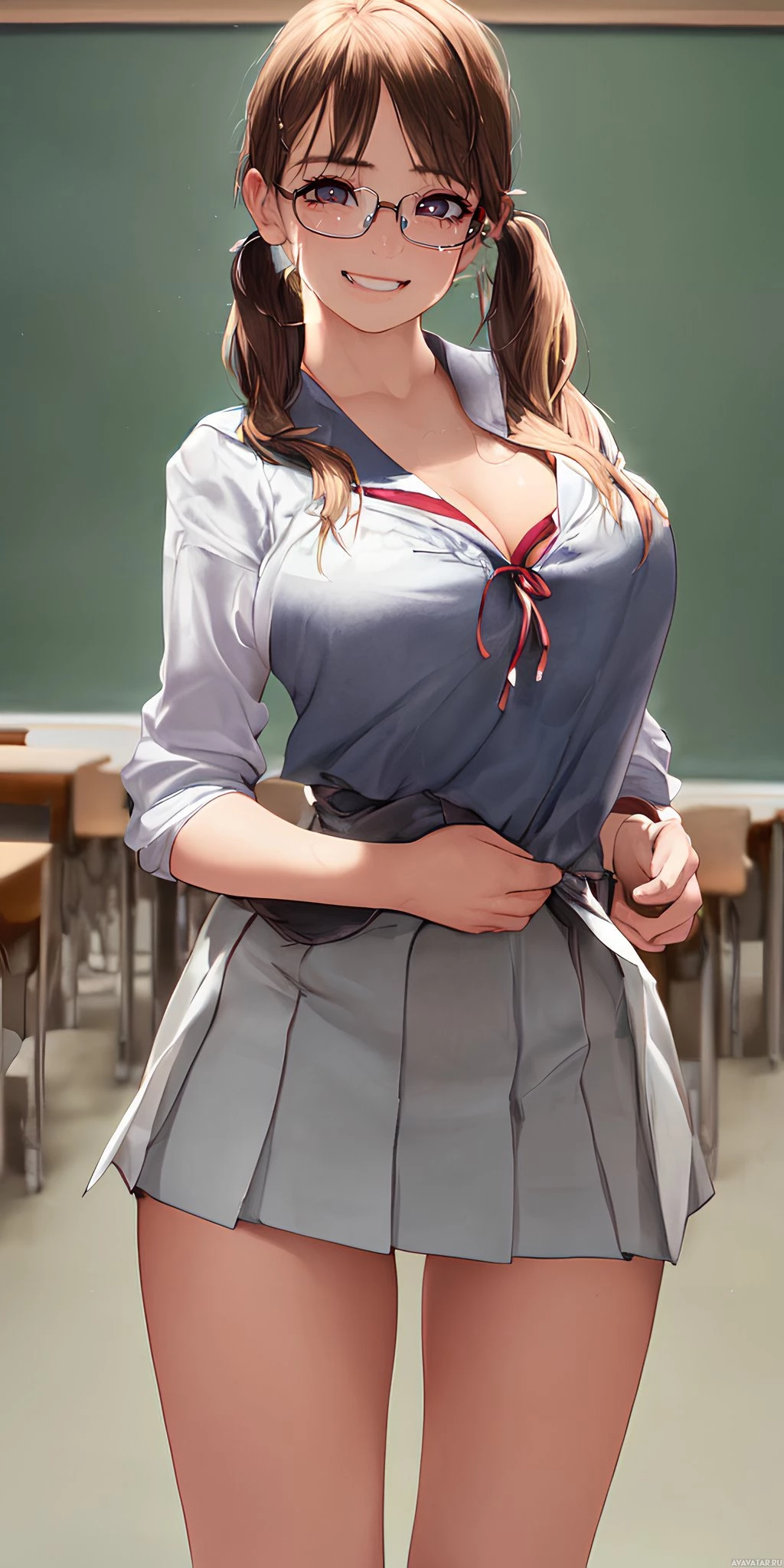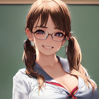 a character from anime. She is depicted as a girl with glasses, dressed in what appears to be school uniform attire, consisting of