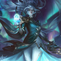 a night sky with auroras. The character is adorned with intricate armor or clothing that gives her an air of being a powerful entity within her