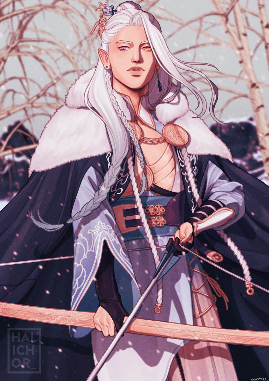 white hair, which is often associated with elves in fantasy settings. The character is wearing traditional-