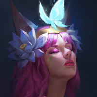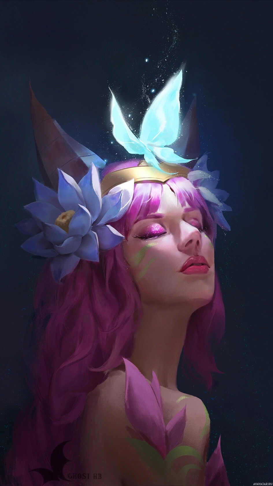 the magical atmosphere of the image. The background is dark, contrasting with her pink hair and highlighting her as the central figure.