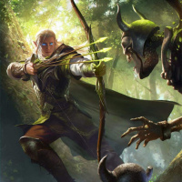 a fantasy scene with an elf wielding a bow. The elf, who appears to be in motion and possibly aiming at or about to attack an opponent, is dressed in traditional